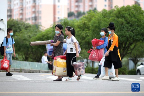 8月22日,在貴州省黔東南苗族侗族自治州丹寨縣第二中學,家長陪伴初一年級新生前往報到處報名。
