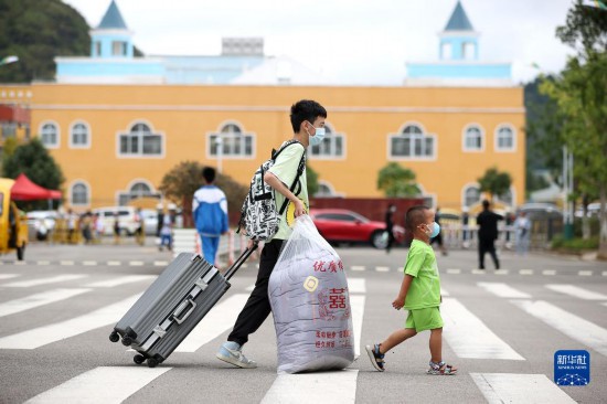 8月22日,在貴州省黔東南苗族侗族自治州丹寨縣第二中學,初一年級新生(左)在弟弟的陪伴下前往報到處。