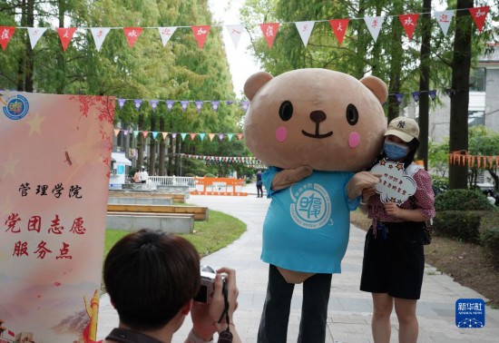 8月28日,復旦大學管理學院新生與學院的吉祥物玩偶合影。