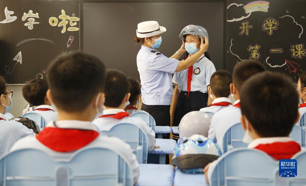 9月1日,在河北省邢臺市逸夫小學,交通民警給學生上交通安全課。