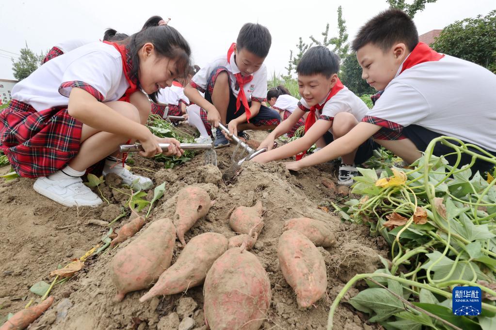 9月1日,浙江省湖州市德清縣雷甸鎮中心小學學生在校園農場挖番薯。