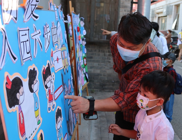 北京市第一幼兒園將疫情防控作為開學第一課的主題,帶領孩子們積極參與到防疫兒歌互動游戲中,還通過趣味體育運動、觀看防疫主題展板等,在邊看邊玩邊做的過程中了解防疫知識,增強防疫意識。