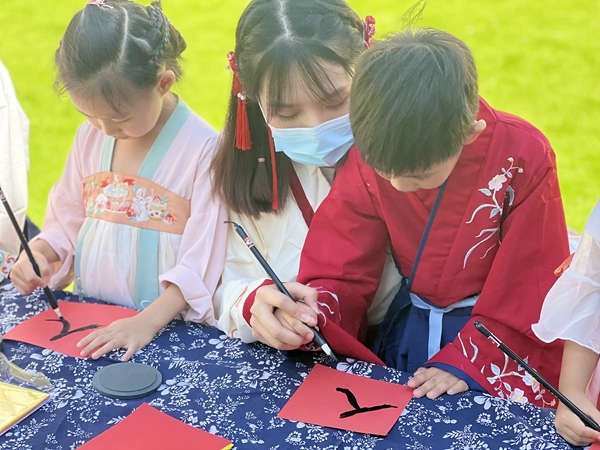 在春江幼兒園,小朋友們認真地學寫人生中的第一個字——“人”!叭恕弊止P畫雖簡單易學,但卻象征著為人要心胸坦蕩、頂天立地的重要意義!叭恕弊滞瓿珊,孩子們拿起小鼓槌在“一鳴驚人,擊鼓增志”儀式環節,鉚足勁兒擊鼓三聲,表明遠大志向,為自己的人生鼓勁加油。
