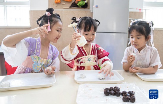 9月8日,浙江省慈溪市陽光幼兒園(北園)的孩子們在制作冰皮月餅。
