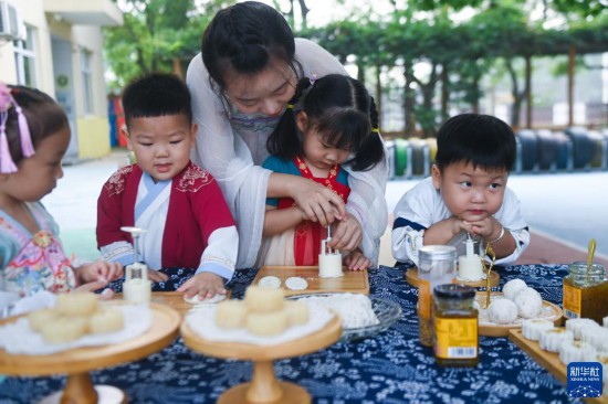 9月8日,長橋中心幼兒園的孩子們在老師的帶領下自制桂花月餅。