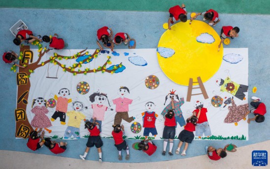 9月8日,長橋中心幼兒園的孩子們在老師的帶領下用廢舊衣物等創作“月圓人團圓”環保創意畫(無人機照片)。