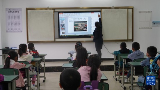 9月14日,老師在瀘定縣二郎山片區寄宿制學校給學生講述抗震救災情況。
