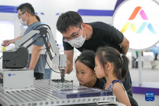 9月17日,在2022年全國大眾創業萬眾創新活動周合肥主會場的主題展區,家長帶著孩子參觀智能協作機械臂。