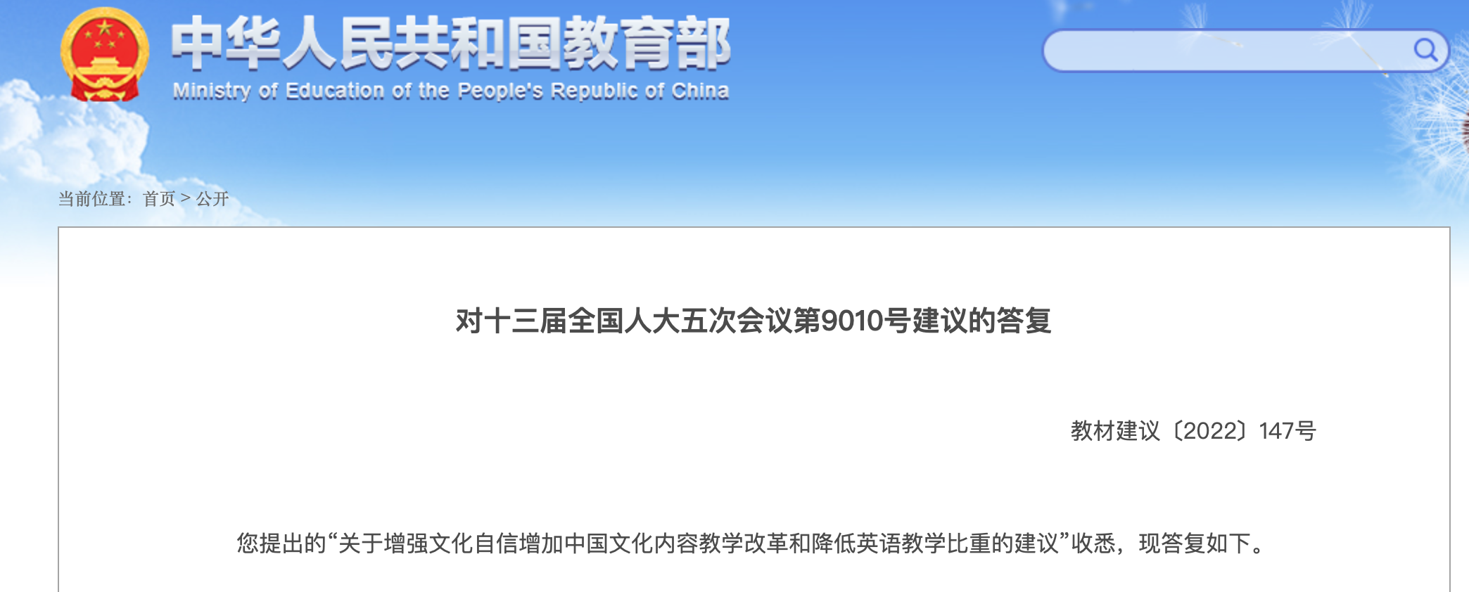 教育部回應“降低英語教學比重”建議:中小學外語課時明顯低于語文等學科