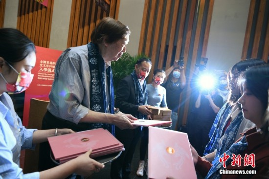 9月27日,中國首屆非物質文化遺產學交叉學科碩士研究生入學儀式在天津大學馮驥才文學藝術研究院舉行。圖為院長馮驥才(左二)與天津大學黨委書記楊賢金(左三)為新生贈送入學禮物。 中新社記者 佟郁 攝