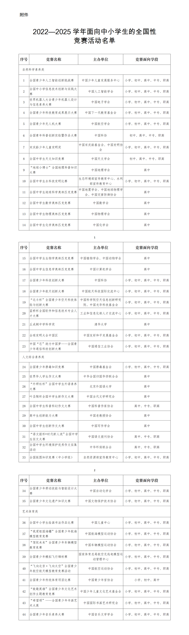 圖為2022—2025學年面向中小學生的全國性競賽活動名單。