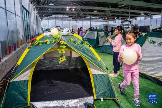 10月5日,在天華百卉園內,小朋友在布置帳篷。