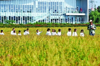 在浙江省湖州市吳興高新區靈糧農場,農技人員帶領小朋友參觀稻田,介紹種糧知識。新華社發