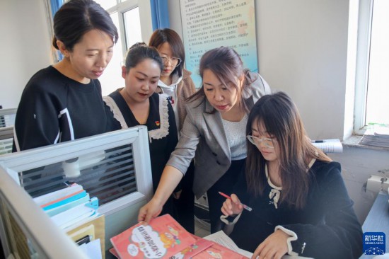 11月8日,在通遼市科爾沁區紅星中心小學,趙穎慧(右二)和老師們開展教研交流。