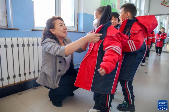 11月8日,在通遼市科爾沁區紅星中心小學,趙穎慧給一名要去做課間操的學生穿好外衣。