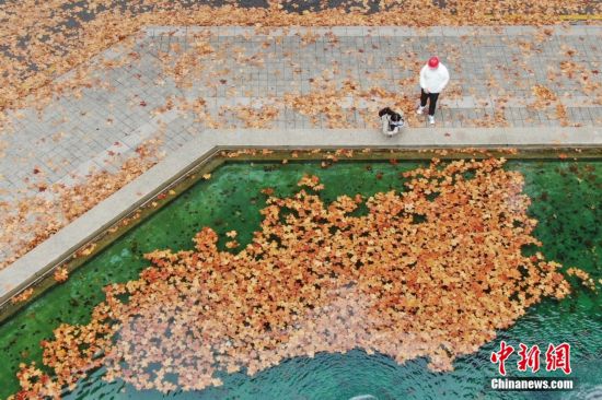 東南大學四牌樓校區大禮堂前池塘內飄滿落葉。(無人機照片) 中新社記者 泱波 攝