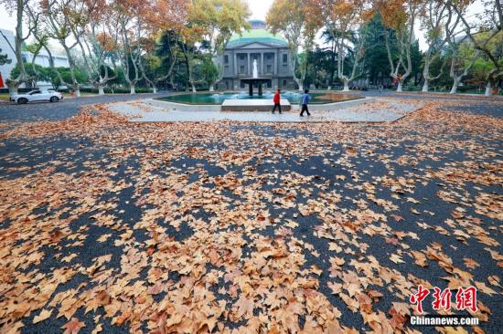 東南大學四牌樓校區內的梧桐樹落葉鋪滿道路。中新社記者 泱波 攝