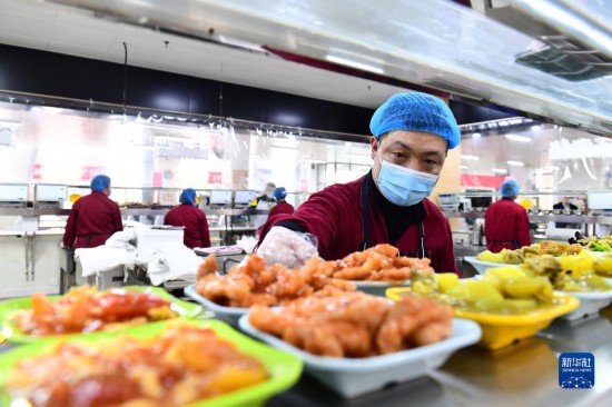 11月16日,在濟南第三中學餐廳,工作人員在備餐。