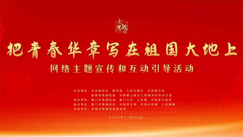 人民網廈門11月25日電 (記者秦迪)中央網信辦、教育部、人民日報社、共青團中央、福建省委網信委、中國載人航天工程新聞宣傳辦公室主辦的“把青春華章寫在祖國大地上”大思政課網絡主題宣傳和互動引導活動25日在廈門大學舉行;顒由,人民網、中國青年報社、中國青年網聯合主辦的“大思政課”云平臺正式上線。