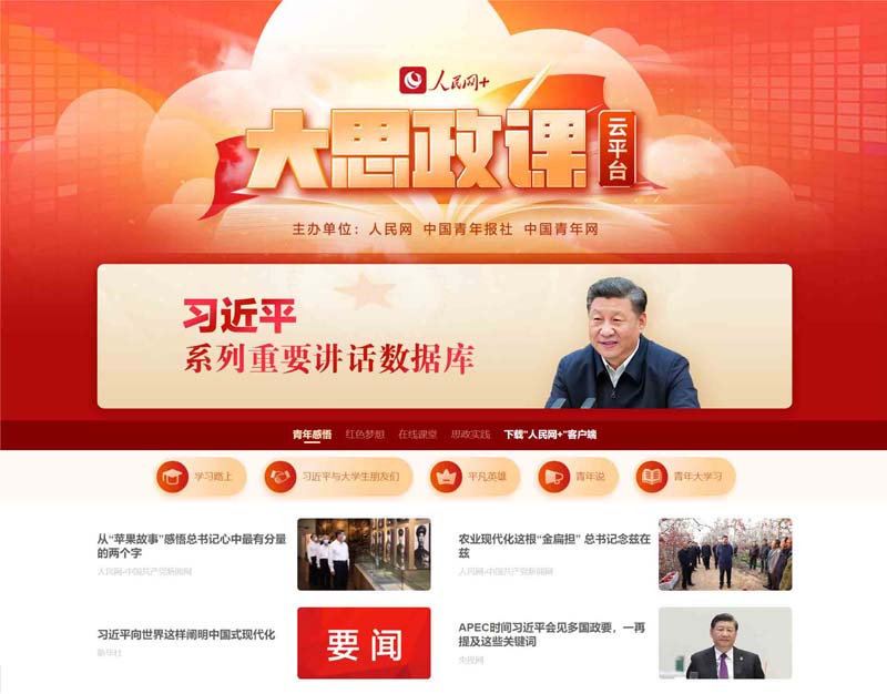 人民網“大思政課”云平臺是人民網整合自身思政領域資源,集納全網優質思政教育內容,面向全國青少年群體打造的思政工作平臺,設置習近平系列重要講話數據庫、青年感悟、紅色夢想、在線課堂、思政實踐等板塊,涵蓋線上與線下、理論與實踐、展覽與培訓等多形態的內容、產品與服務。云平臺以“人民網+”客戶端為主陣地,并可靈活嵌入各類智能終端,實現最廣泛觸達青少年群體。