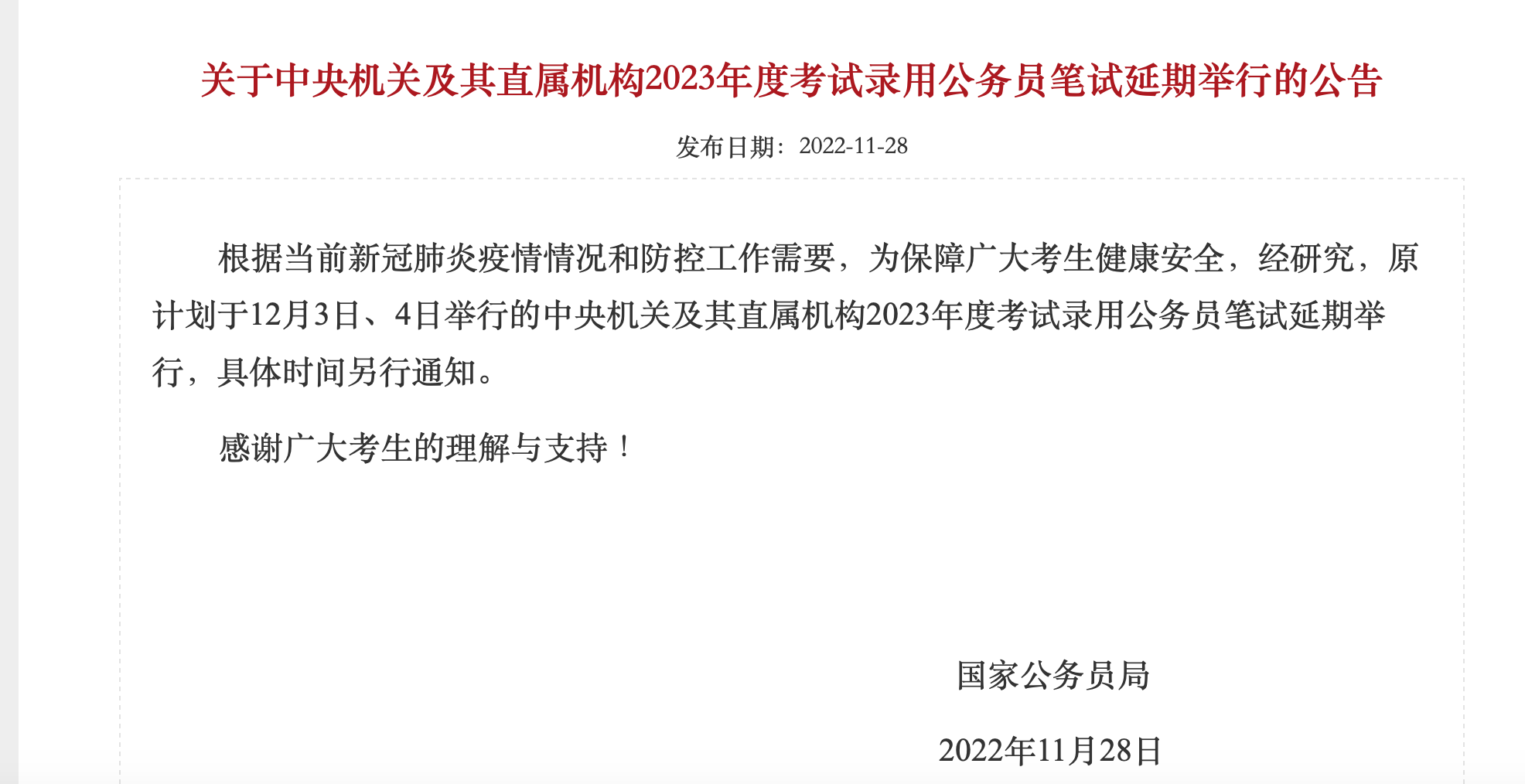 人民網北京11月28日電 (記者李依環)據國家公務員局網站消息,國家公務員局今天發布《關于中央機關及其直屬機構2023年度考試錄用公務員筆試延期舉行的公告》。公告指出,根據當前新冠肺炎疫情情況和防控工作需要,為保障廣大考生健康安全,經研究,原計劃于12月3日、4日舉行的中央機關及其直屬機構2023年度考試錄用公務員筆試延期舉行,具體時間另行通知。