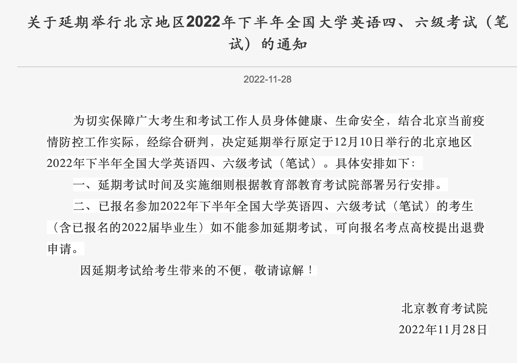 北京教育考試院通知指出,已報名參加2022年下半年全國大學英語四、六級考試(筆試)的考生(含已報名的2022屆畢業生)如不能參加延期考試,可向報名考點高校提出退費申請。