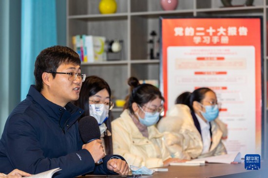 12月4日,江蘇省南京市六合區農民畫美術館內,一場以江蘇省非物質文化遺產六合農民畫為載體的黨的二十大精神宣講會舉行。這是冶山街道雙墩村黨總支書記耿云松(左一)在發言。新華社發(張夢攝)