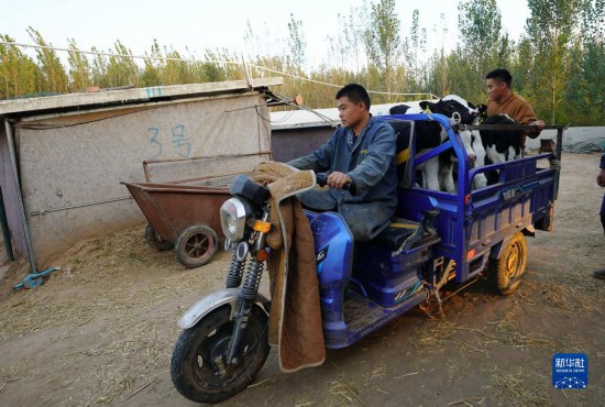 2022年10月19日,程鵬飛(左)和工人一起將剛買來的牛犢運到牛舍。