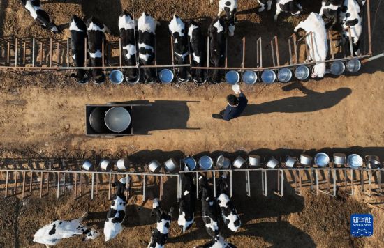 12月28日,程鵬飛在牛舍喂牛(無人機照片)。