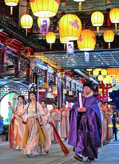 上海豫園內上演國風主題表演“仲秋月神游”。新華社發