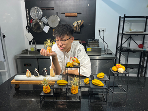 在佛山市順德區中等專業學校的幫助下,陳小東開設了“東廚工作室”,以培訓目的為主,帶領學生一起制作國潮面點,通過自身技藝將學生們腦海中天馬行空的想法付諸實踐。學校的其他老師也為其出謀劃策,幫助他進行中西結合的菜式改良與新派國潮穌點的研發。