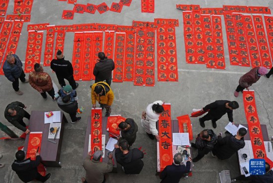 春節臨近,多地組織書法志愿者走進社區、工地等場所,為人們書寫春聯和福字,迎接春節的到來。