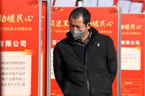 1月11日,2023年“創響江蘇”春風行動聯合招聘會在南京市浦口區舉行。圖為一名求職者在招聘會現場查看招聘信息。 新華社記者 李博 攝