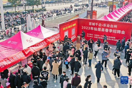 1月27日,求職者在浙江省臺州市仙居縣新春招聘會上尋找心儀的職位(無人機照片)。