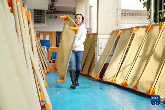 1月31日,在重慶市北碚區一家幼兒園,一名教師在晾曬孩子們的寢具。