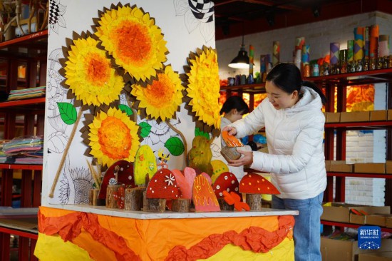 1月31日,在重慶市北碚區一家幼兒園,一名教師在整理教具。