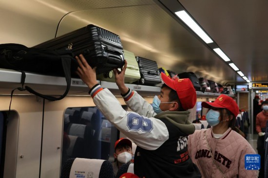 1月30日,旅客在D2879次務工專列上放行李。這是2023年貴陽開出的首趟高鐵務工專列。新華社記者 劉續 攝
