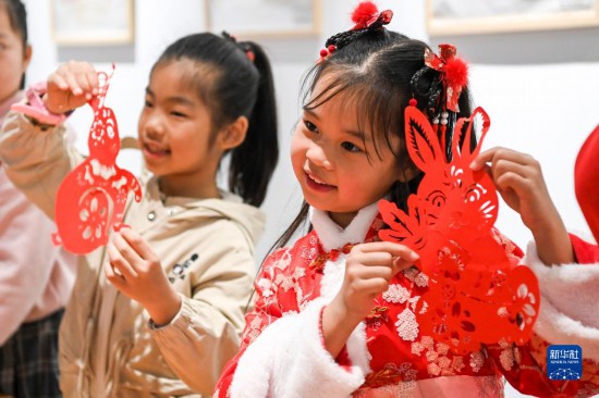 2月2日,在興業書畫院,學生們在展示自己的剪紙作品。