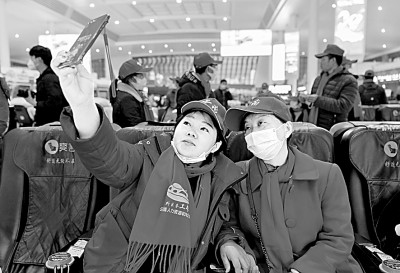 云南暢通返崗就業通道。圖為兩名務工人員在昆明南站候車廳候車時拍照。新華社發