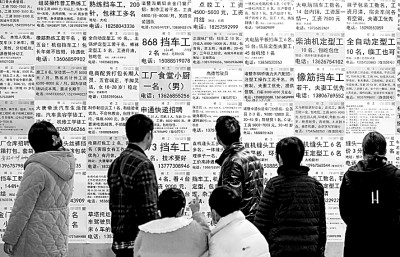 外來務工者在浙江省諸暨市大唐街道勞動力市場內查看招工信息。新華社發