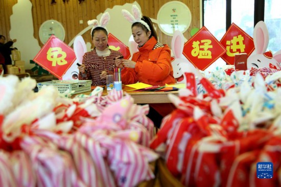 2月9日,福建武夷山百花幼兒園的老師們在為孩子們準備兔年福袋。