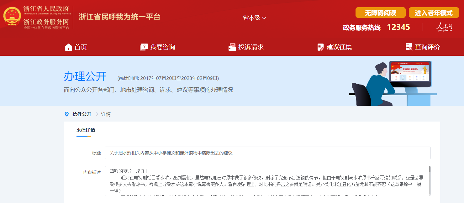 人民網北京2月10日電 (記者孫競、李依環)近日,有網民在浙江省政府網站建議“把《水滸》相關內容從中小學課文和課外讀物中清除出去”。對此,浙江省教育廳教研室日前作出專門答復。