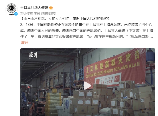 2月15日,土耳其駐華大使館通過官方微博發文,感謝中國人民捐贈物資。