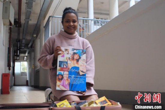圖為斯里蘭卡籍留學生張安妮正在展示自己行李箱中家人的照片。劉俊聰 攝