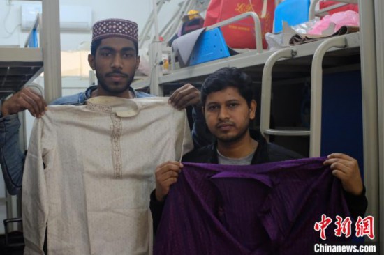 圖為兩名孟加拉國籍留學生正在展示自己的傳統服飾。劉俊聰 攝