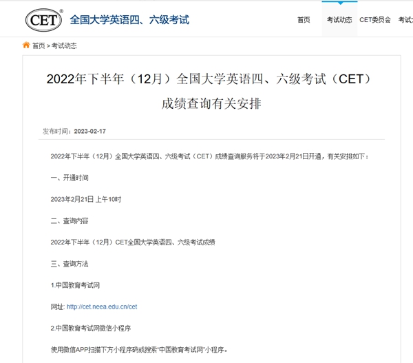 人民網北京2月21日電 (記者李依環)據教育部教育考試院網站消息,2022年下半年(12月)全國大學英語四、六級考試(CET)成績查詢服務于今天上午10時開通,考生可通過中國教育考試網及其相關小程序查詢考試成績。2月28日10時起,考生可登錄中國教育考試網,免費查詢、下載本次考試電子成績報告單。
