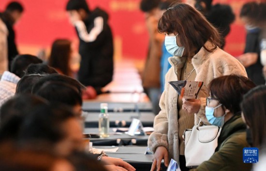 2月19日,在天津經濟技術開發區春季促就業暖心行動公益現場招聘會,招聘企業工作人員與求職者交流。新華社記者 趙子碩 攝