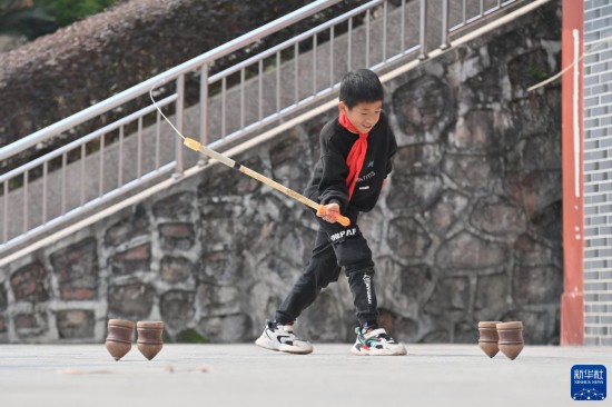 2月22日,廣西蒙山縣夏宜民族學校學生在體育課上打陀螺。