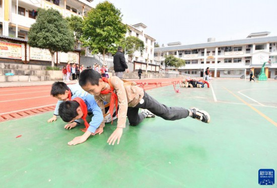 2月22日,廣西蒙山縣夏宜民族學校學生在體育課上進行“大象拔河”。