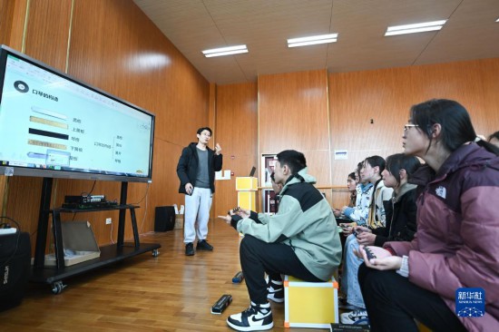 2月23日,上海援青教師闞延俊在給學生上音樂課。